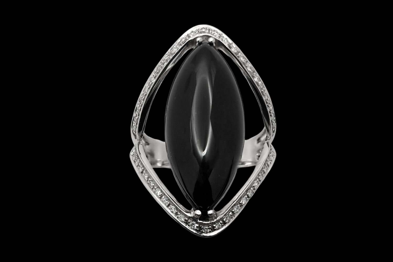 El Ónix tiene talla Cabujón Marquise (o Navette) con aproximadamente 24 x 12 mm.